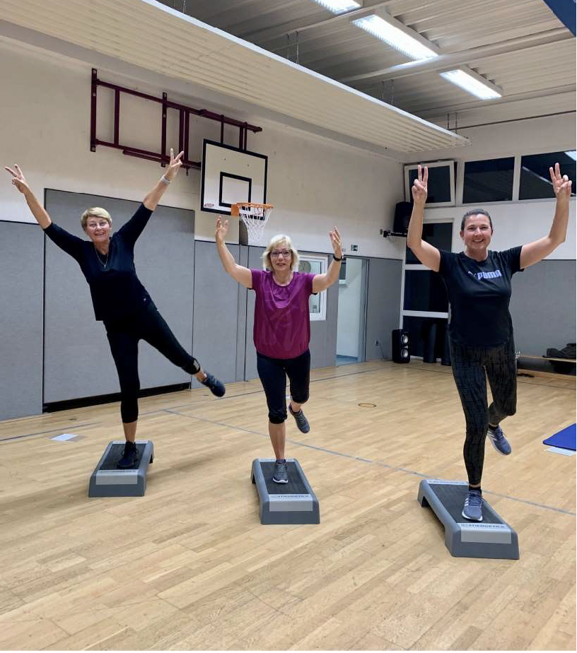 Nach einem ersten Cardio-Teil zum Rhythmus der Musik für eine verbesserte Ausdauer und Koordination wird auf der Matte weiter trainiert. Hier werden Kräftigungs- und Mobilisierungsübungen mit dem eigenen Körpergewicht z.B. aus dem BOP oder dem Pilates-Bereich geboten. Die Stunde wird immer begleitet von fetziger Musik – bis zum Cool-down… In den Übungsstunden werden je nach Lust und Laune der Übungsleiterin unterschiedlichste Hilfsmittel, wie z.B. Pilates-Bälle, Therabänder, kleine Hanteln oder auch mal die Stepper eingesetzt.